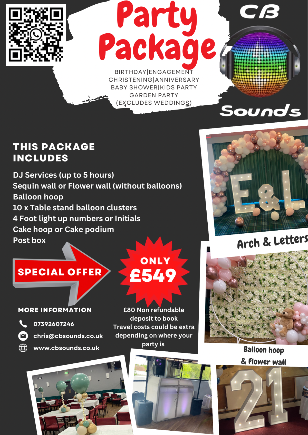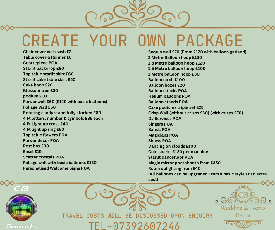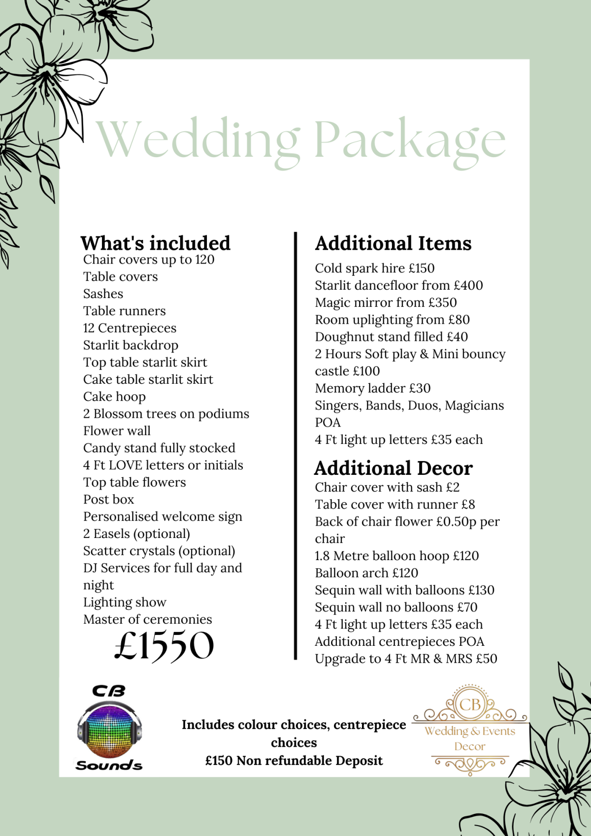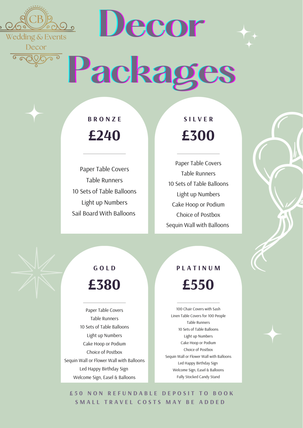 Packages for all occasions, feel free to browse through them and get in touch for further info or if you'd like to discuss about adjusting a package to suit you more, or better still check out our create your own package and have it your way from start to finish.